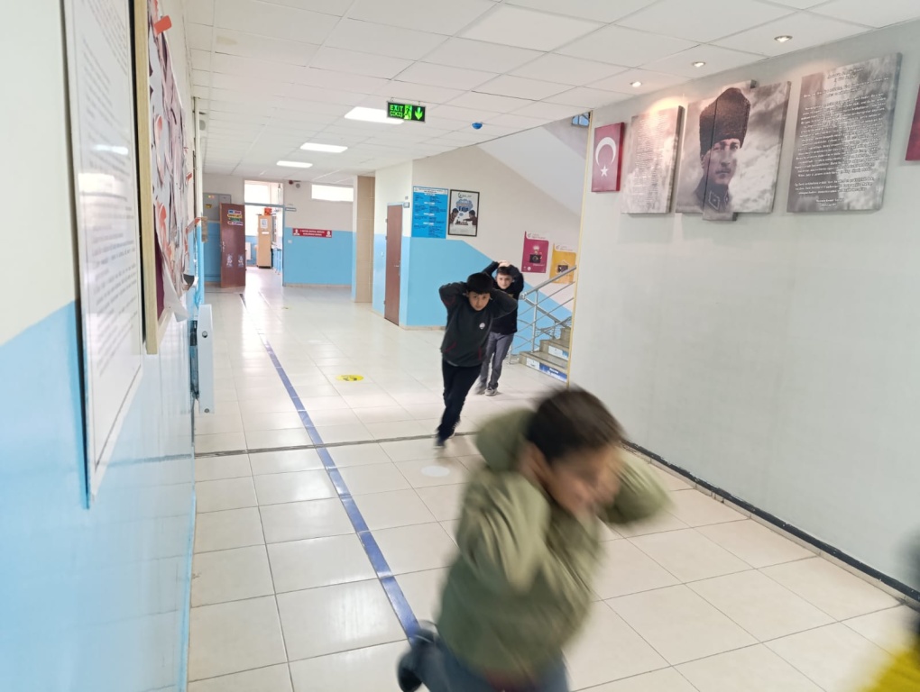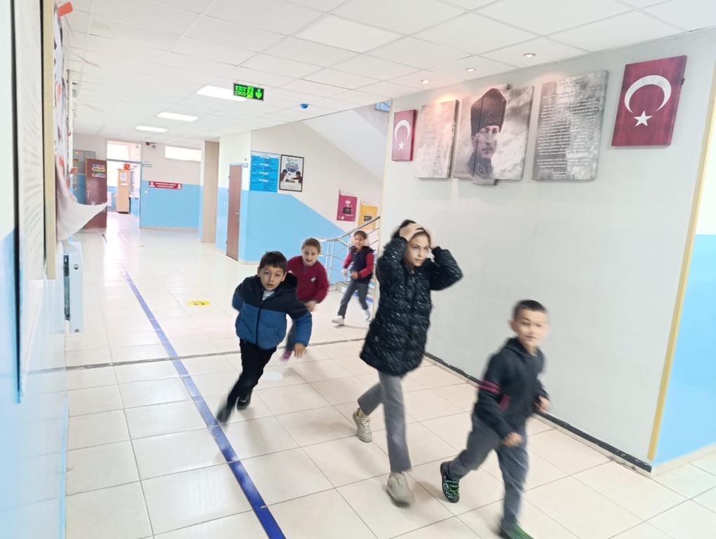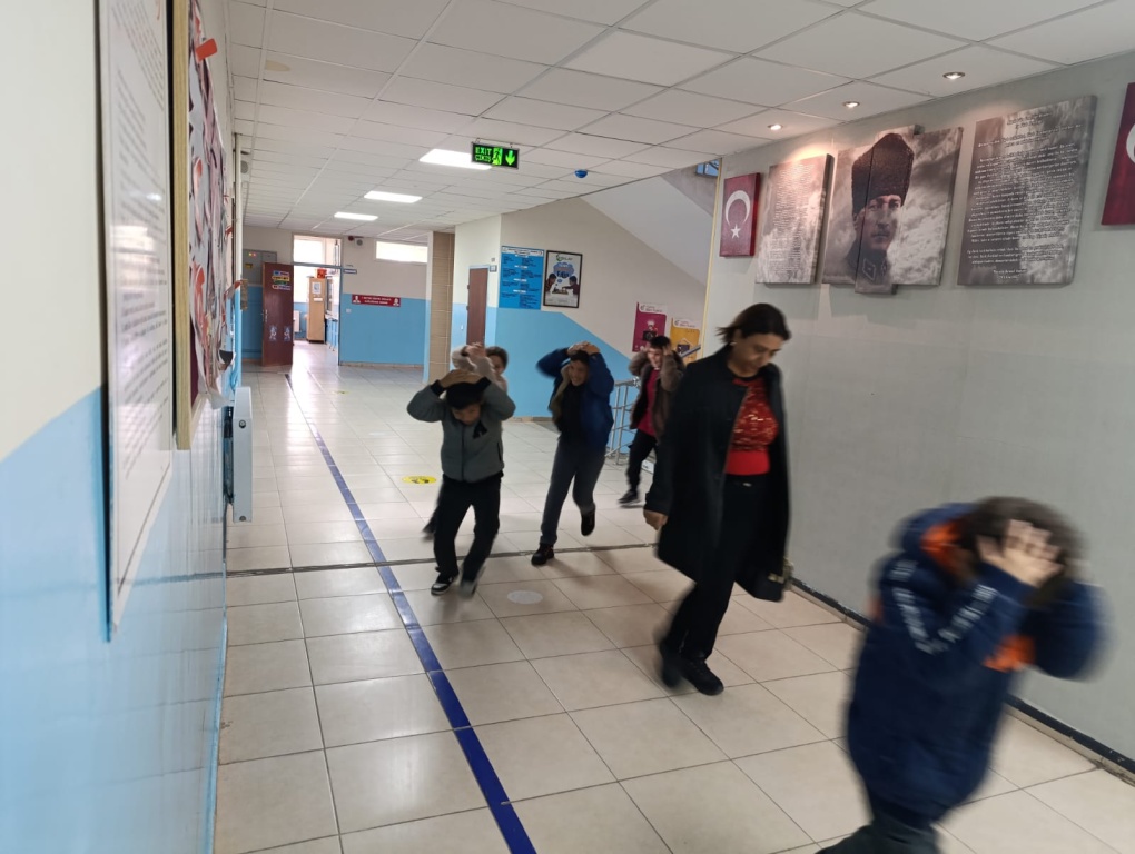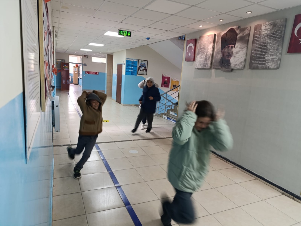 Okulumuzun tüm alanlarında çalan acil durum zil sesi ile “Çök, Kapan, Tutun” hareketi yapılarak zil sesinin bitmesi beklendi. Zil sesinin bitmesinin ardından yapılan duyuruyla öğrencilerimiz, öğretmenlerinin yönlendirmeleriyle tek sıra halinde bulundukları alanlardaki tahliye planını izleyerek, binayı terk edip toplanma alanlarına ulaştı.