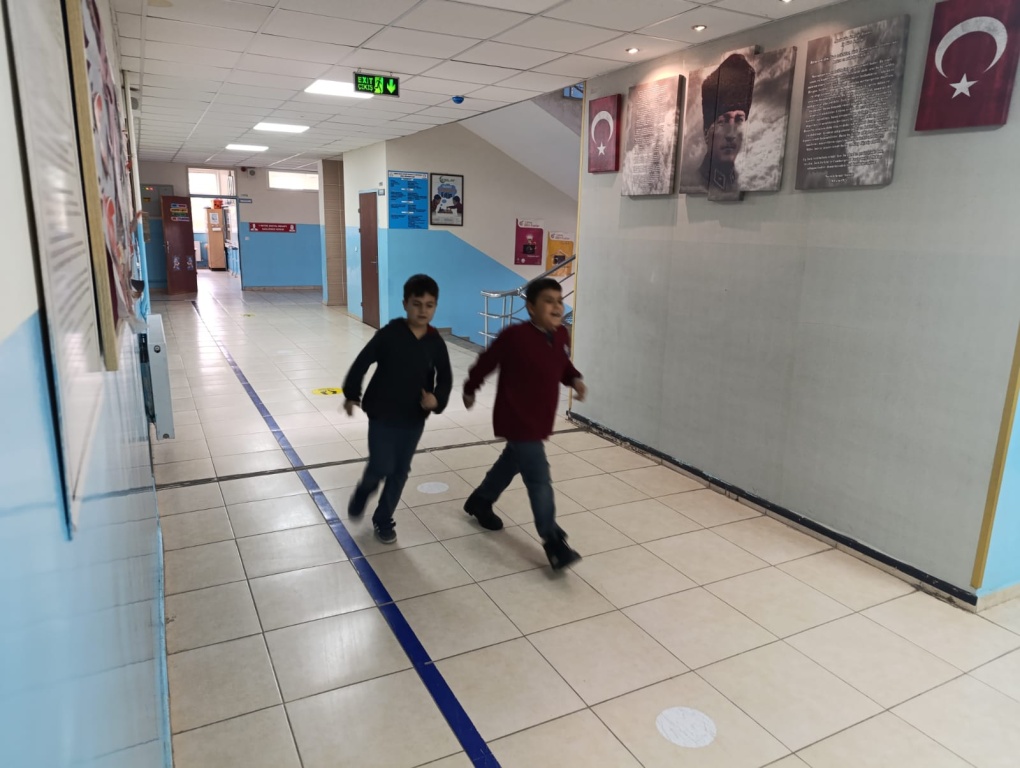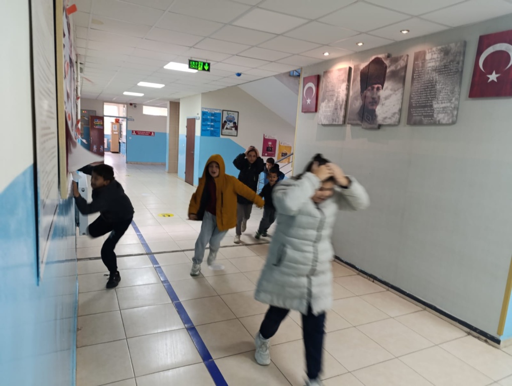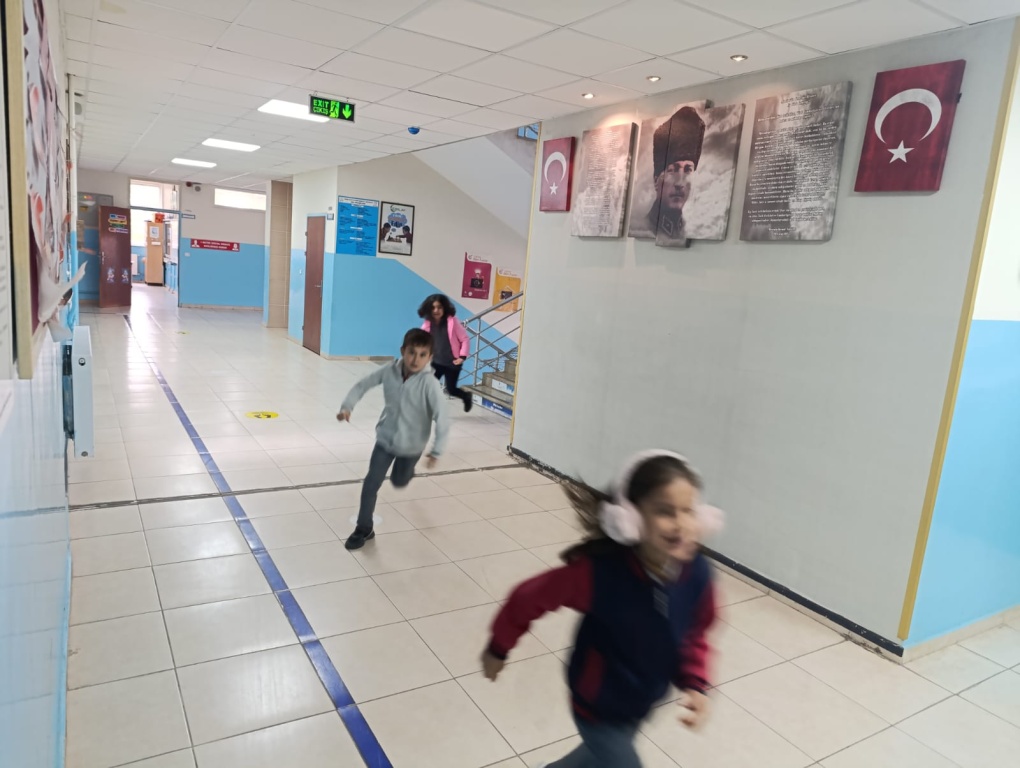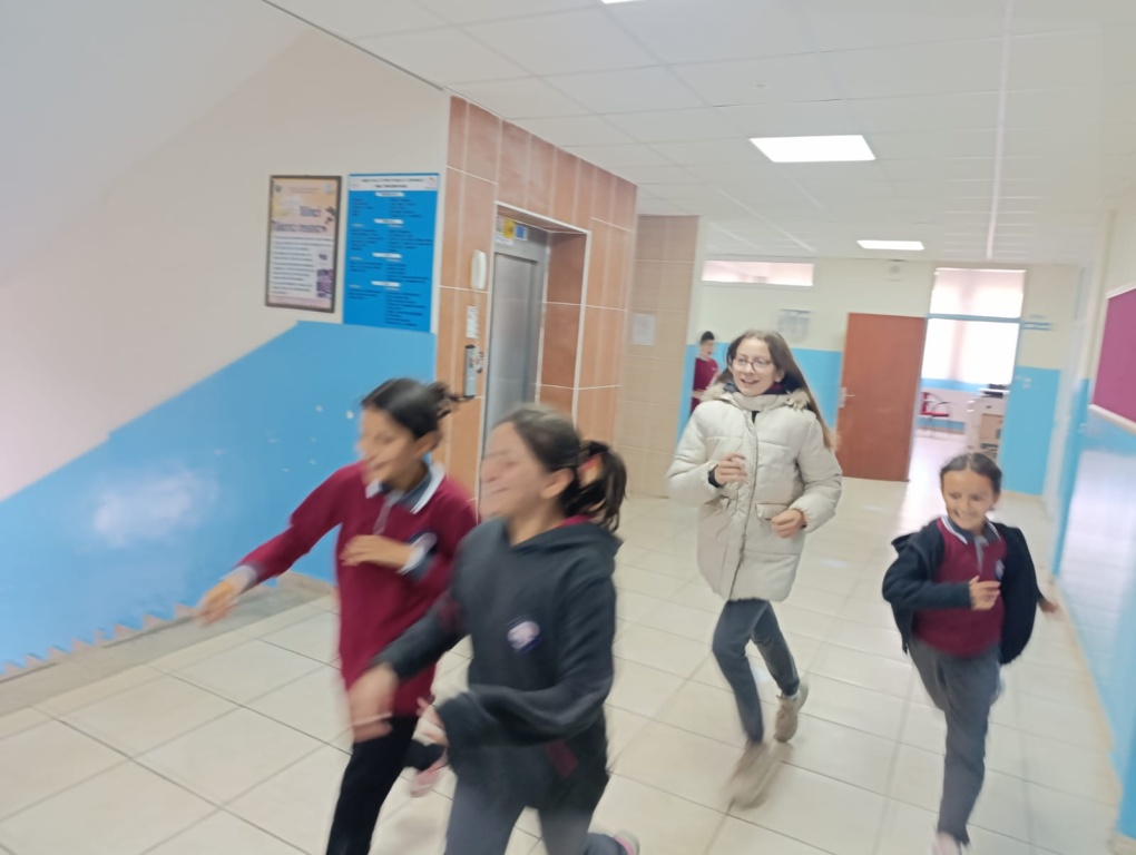 Okulumuzun tüm alanlarında çalan acil durum zil sesi ile “Çök, Kapan, Tutun” hareketi yapılarak zil sesinin bitmesi beklendi. Zil sesinin bitmesinin ardından yapılan duyuruyla öğrencilerimiz, öğretmenlerinin yönlendirmeleriyle tek sıra halinde bulundukları alanlardaki tahliye planını izleyerek, binayı terk edip toplanma alanlarına ulaştı.
